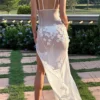 Women Sheer Mesh Sleeveless Dress Summer V Neck Flower Slit Party Dress for Cocktail Beach Club Streetwear