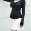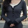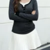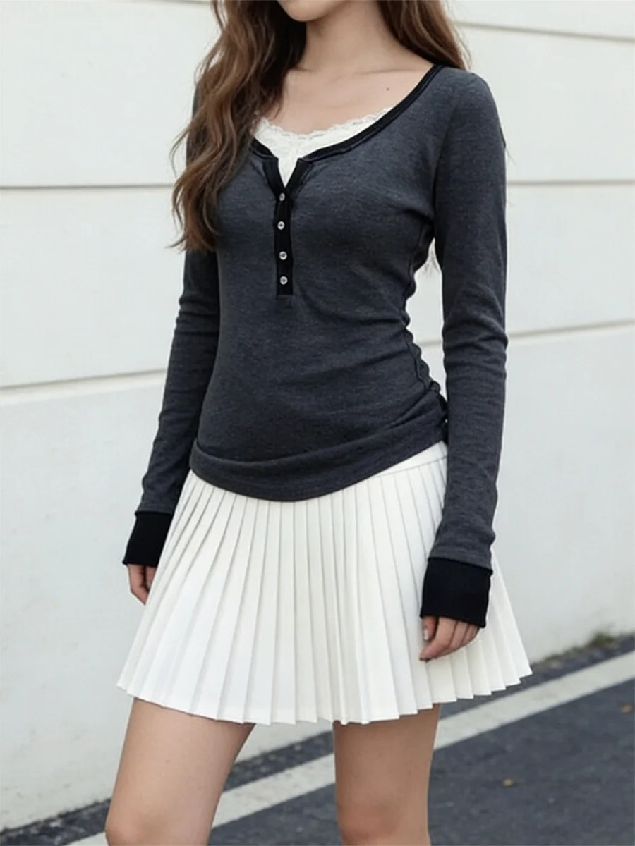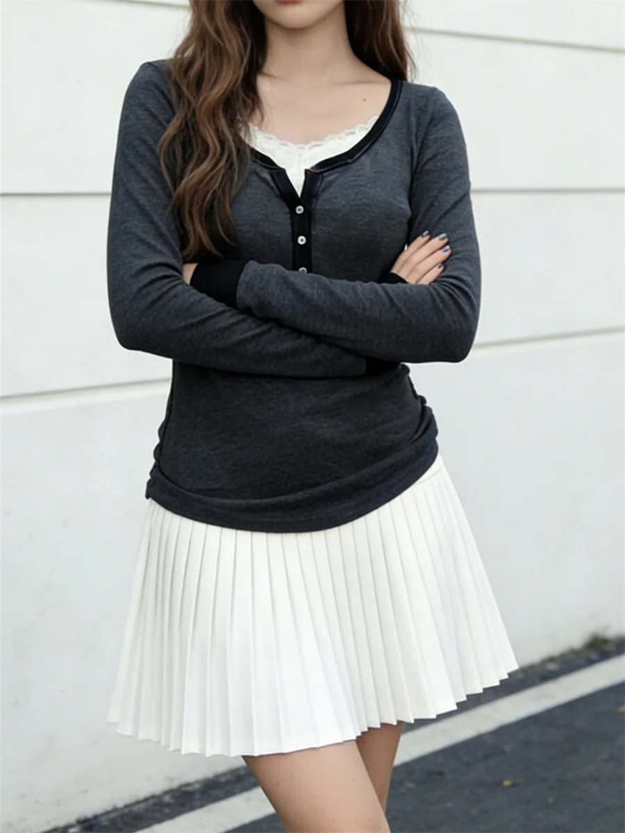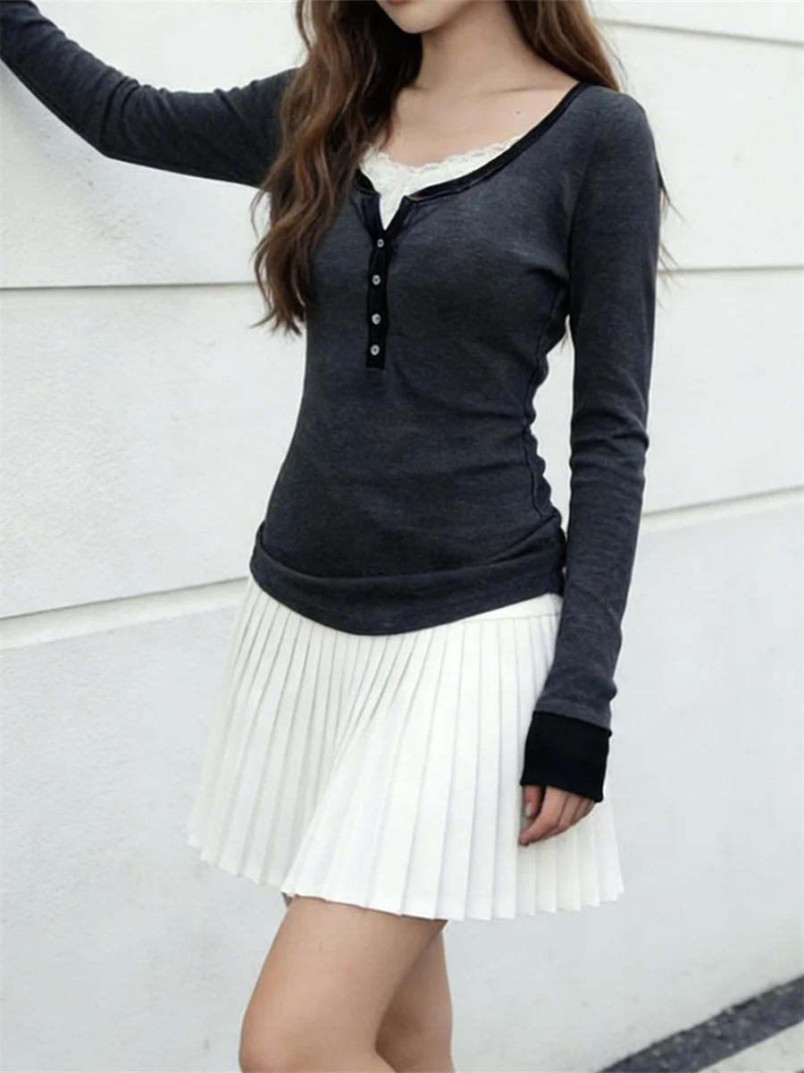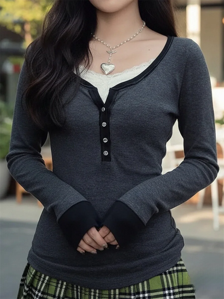 Women’s Long Sleeve Tops Casual Slim Fit Stylish Contrast Trim Lace Patchwork Crew Neck T-Shirt for Fall/Spring